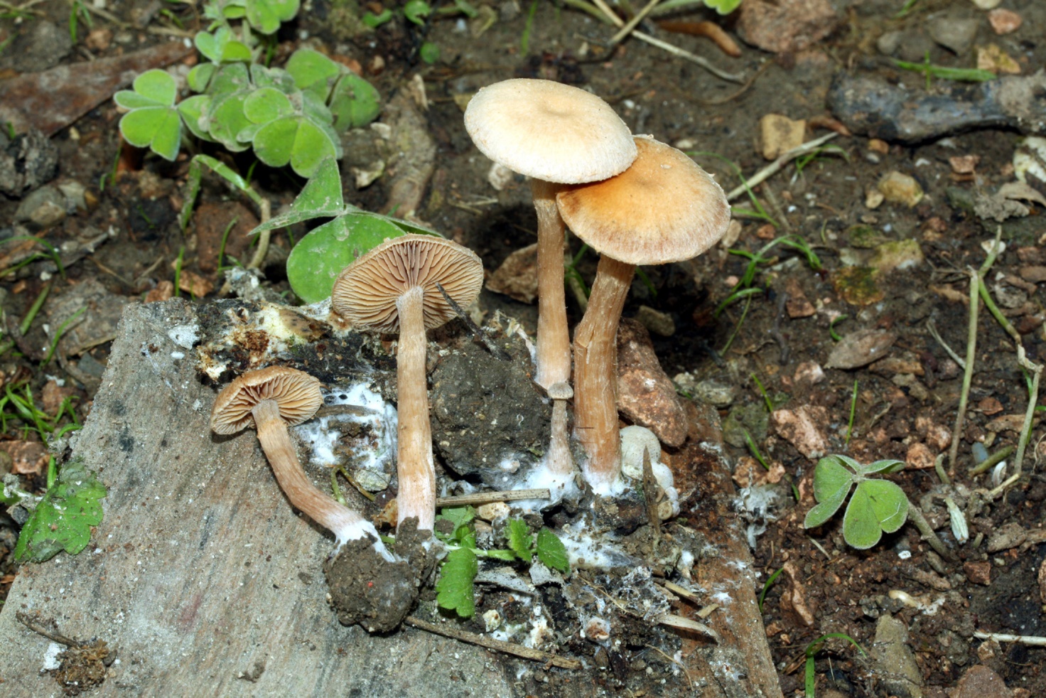 Gambo: nel giovane cilindraceo, slanciato, canalicolato, 4,5 x 0,7 cm, finemente striato, appena fibrilloso, sopra l’anello pruinoso. Spesso anche molto ingrossato, cavo e svasato in alto, nella zona anulare presenta un rigonfiamento evidente. Base ricoperta da abbondanti rizoidi biancastri.
